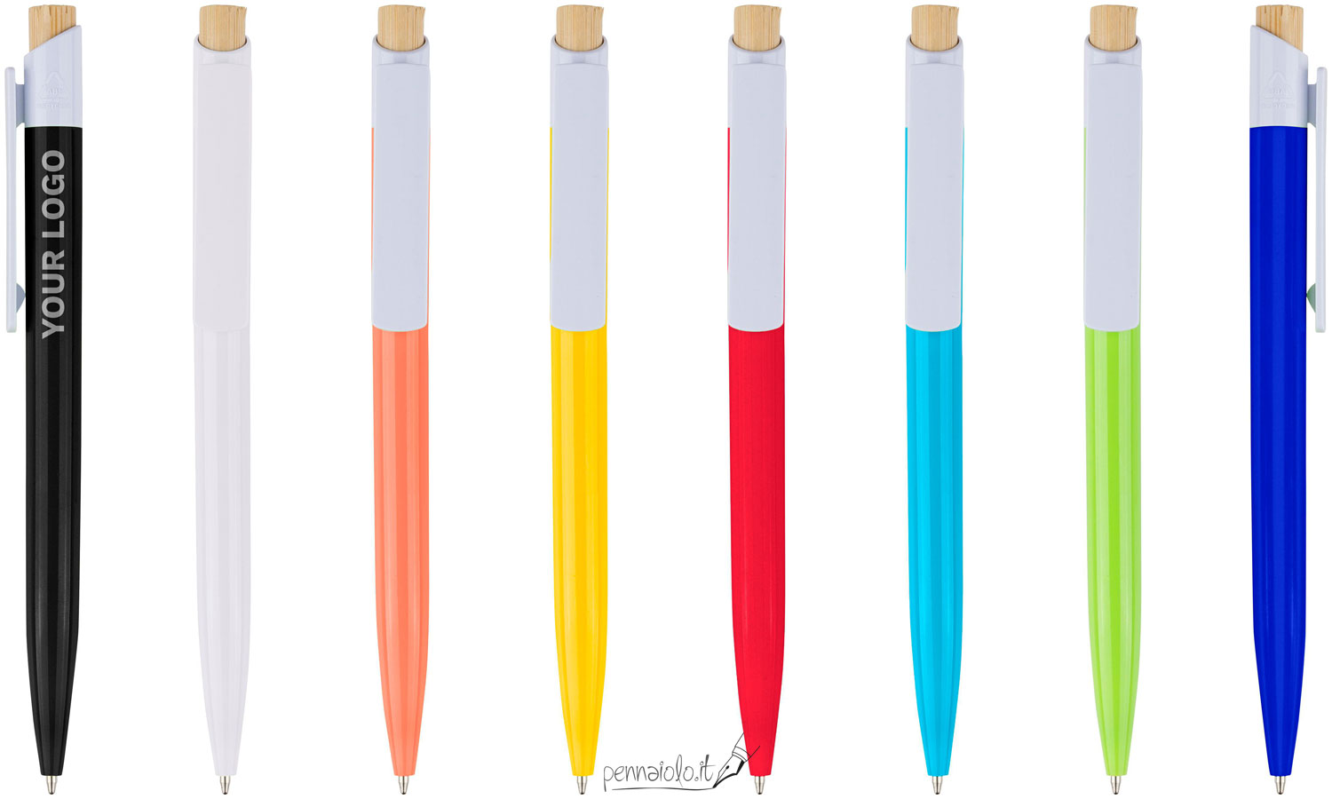 Penna Biodegradabile Bic MEDIA CLIC BIO, logo "Biodegradabile" stampato a fianco delle clip, corpo e accessori in abbinamento colori a scelta |